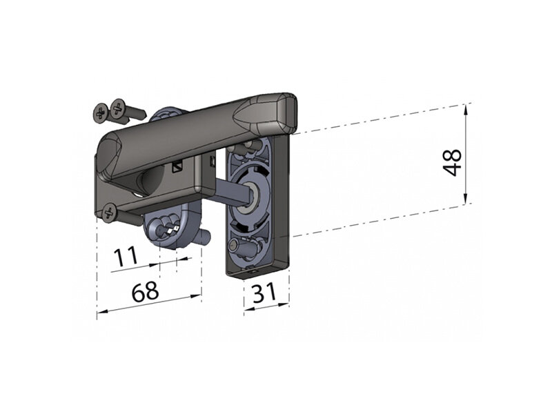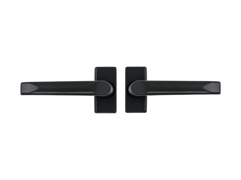 Komplet obustronnych aluminiowych klamek H1 na krótkich szyldach do drzwi profilowych. Klamka na szyldzie zewnętrznym i wewnętrznym z mechanizmem sprężyny cofającej. Konstrukcja wewnętrzna rozety PZ: metalowa bez czopów ustalających. Mocowanie zakrywanymi wkrętami.