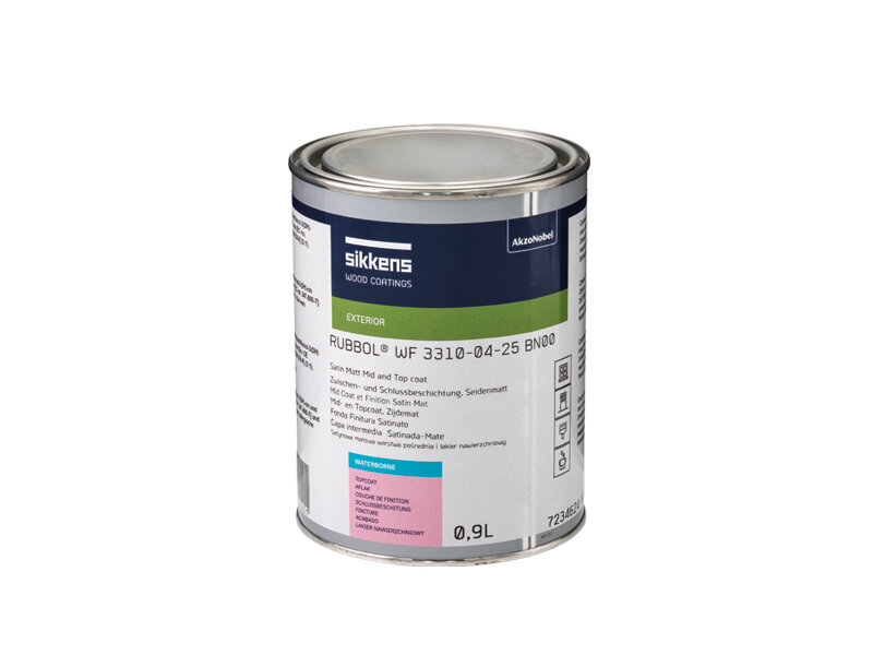 Sikkens Rubbol WF3310 lakier nawierzchniowy kryjący półmat, wodorozcieńczalny. Zastosowanie jako powłoka pośrednia i końcowa do renowacji elementów drewnianych, wewnątrz i na zewnątrz.